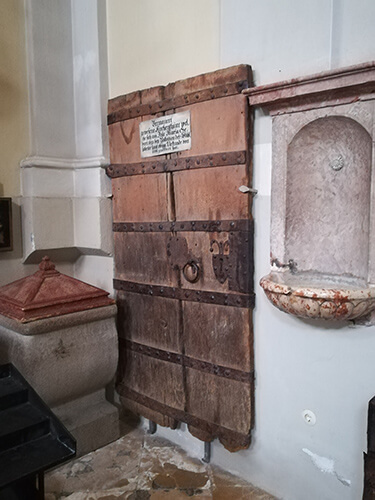 Am anderen Tage wollten nun genannter Herr Graf und seine Pastoren sehen, was die Katholischen tun werden, wenn sie alle Eingänge zu die Kirche verschlossen finden werden; sie versteckten sich daher hinter dem kleinen Sankt Anna-Kirchlein, das der Wallfahrtskirche gerade gegenüberlag. Als nun die Wallfahrer in der schönsten Ordnung und mit der größten Andacht bei diesem Gnadenhause, unwissend von allem dem, was geschehen war, anlangten und die Kirchentüre mit dem Fähnlein so ein Knab getragen nur angerührt wurde "STEHET STILL UND SEHET DAS GROSSE WUNDER, DAS DER HERR HEUTE WIRKEN WIRD (Ex 14)" hat sich nicht nur allein die so gut verschlossene Türe geöffnet, sondern ist auch die hinter derselben aufgeführte Mauer zusammengestürzt.